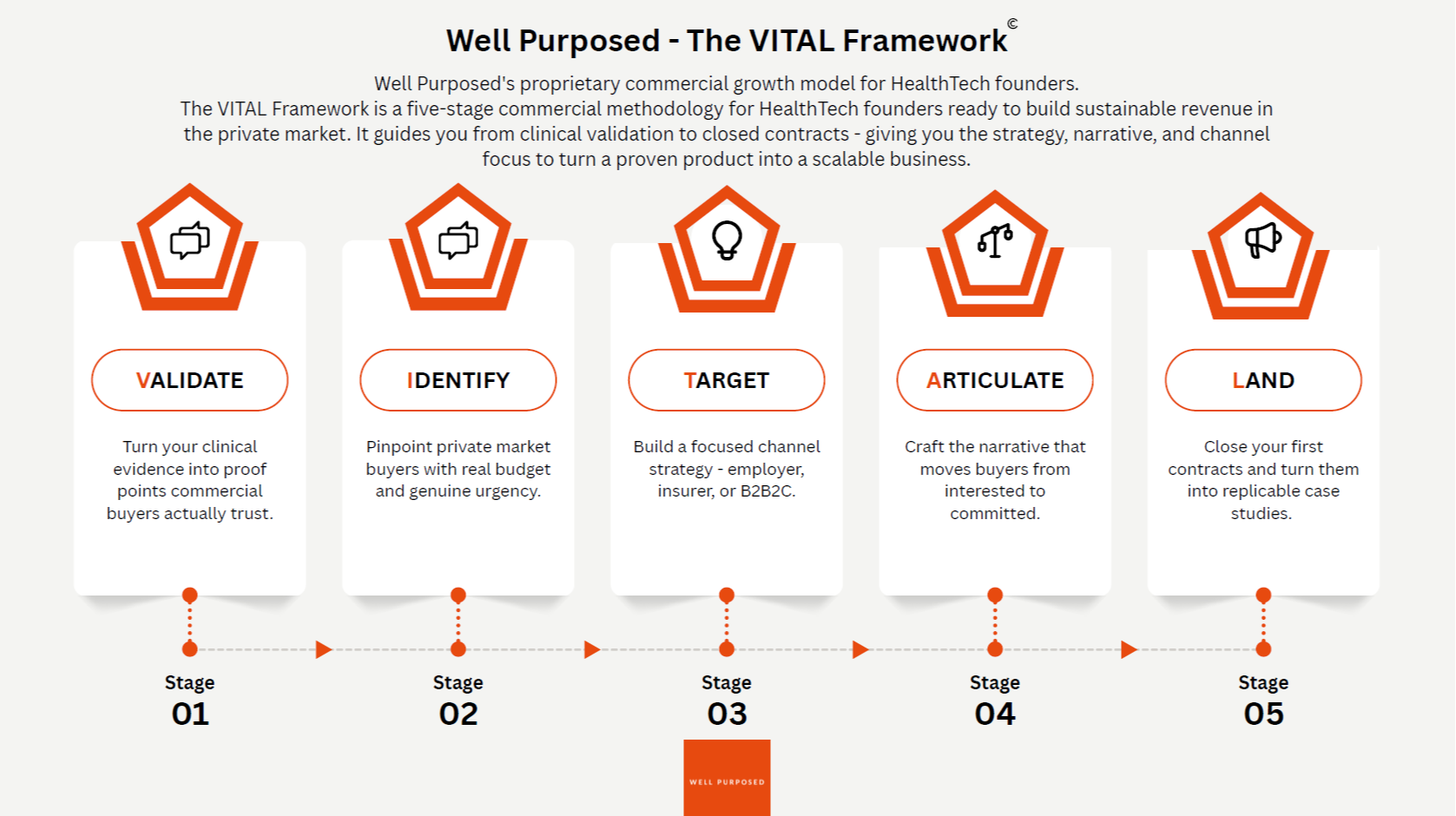 Well Purposed partners with HealthTech, longevity and impact founders to turn post-raise pressure into repeatable growth - expanding into new markets, securing strategic partnerships, and building companies where profit and purpose reinforce each other.